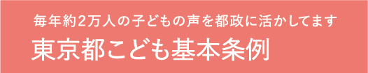 2021年に議員提案でつくった条例。「子どもの権利条約」の精神にのっとり、安全安心、遊び場、居場所、学び、意見表明、権利擁護などを定めました。子ども政策を一元的に進める部署(子供政策連携室)を新設し、約2万人の子どもの声を聞きながら「子ども未来アクション」を進めています。子ども向けの都政ホームページも開設され7000万PVを記録。